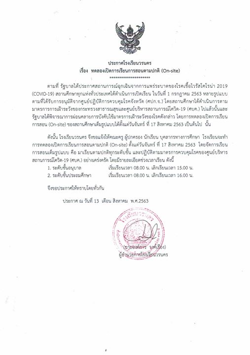 ประกาศโรงเรียนวรนคร เรื่องทดลองเปิดการเรียนการสอนตามปกติ (On-site)
