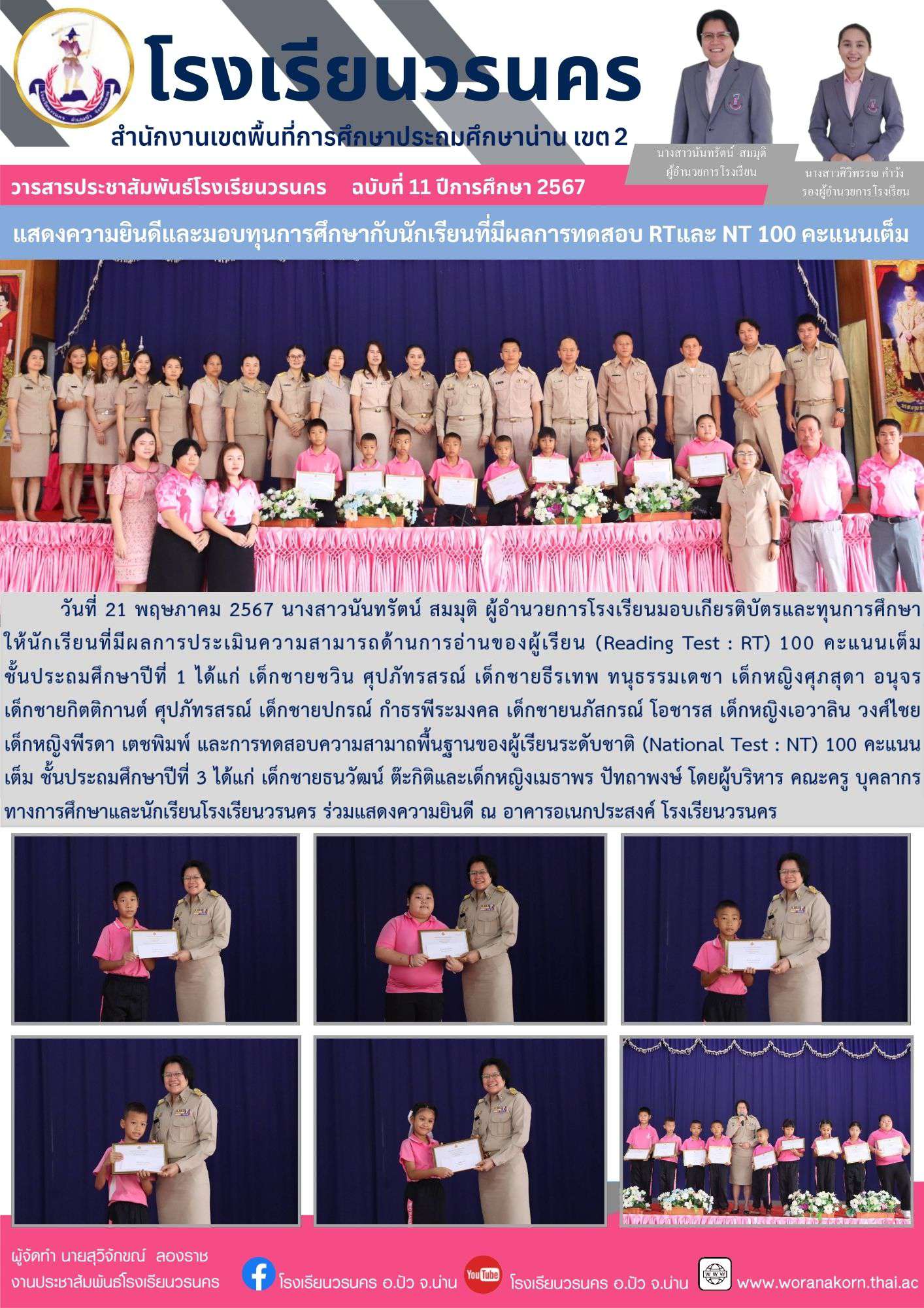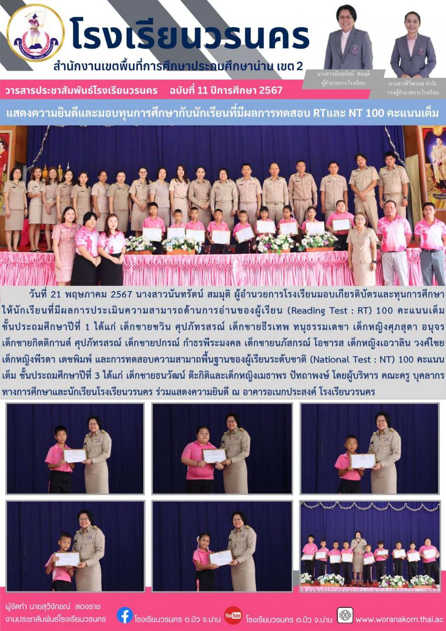 แสดงความยินดีและมอบทุนการศึกษากับนักเรียนที่มีผลการทดสอบ RTและ NT 100 คะแนนเต็ม